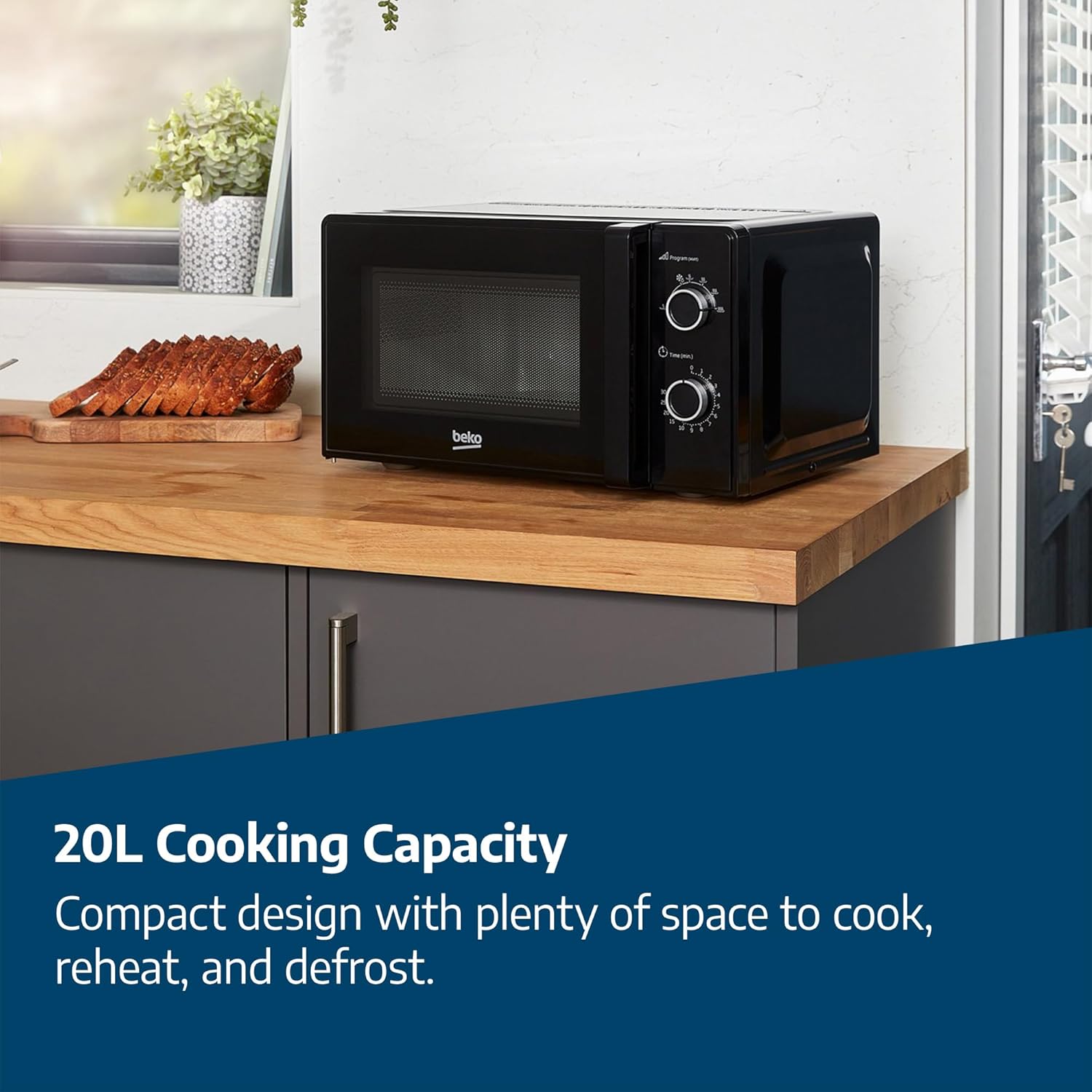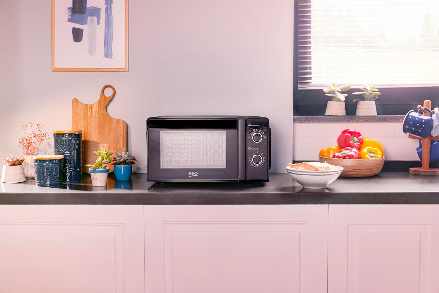 Beko MOC20100BFB Mikrowelle Solo 20 Liter, 700 W, Timer max. 30 min, 5 Stufen, Auftau- und Aufwärmfunktionen, Einstellung mit Drehknopf, Endanzeige, Drehteller mit 24,5 cm Durchmesser, Schwarz