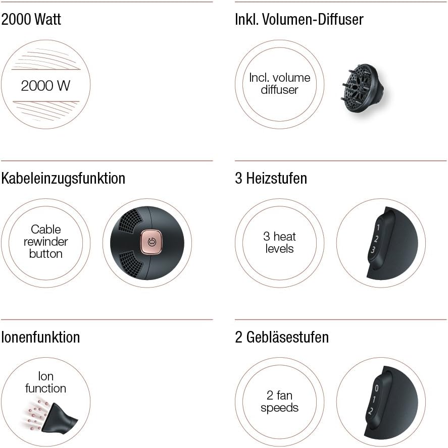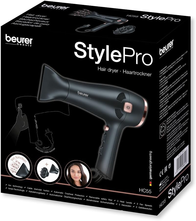 Beurer Haartrockner HC55. Mit Ionen-Technologie für geschmeidiges und glänzendes Haar. Schmale Profidüse und Volumen-Diffusor. 3 Heizstufen und 2 Gebläsestufen, Kaltstufe zur Fixierung des Stylings. Soft Touch Oberfläche, abnehmbarer Sicherheitsfilter – für eine leichte Reinigung. Automatischer Überhitzungsschutz.