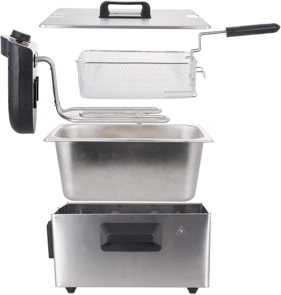 mit 3 l Fassungsvermögen. Aluminium-Innentopf, antihaftbeschichtet. Thermostat von 80 bis 190 °C. Abnehmbarer Deckel mit Sichtfenster. Schnell einsatzbereit. Frittierkorb spülmaschinengeeignet. Dank der Kaltzonentechnik verbrennen herabgesunkene Lebensmittelreste nicht. Das Öl ist länger verwendbar und der gute Geschmack bleibt erhalten. 2000 Watt. Maße ca. B41xH23xT22 cm.