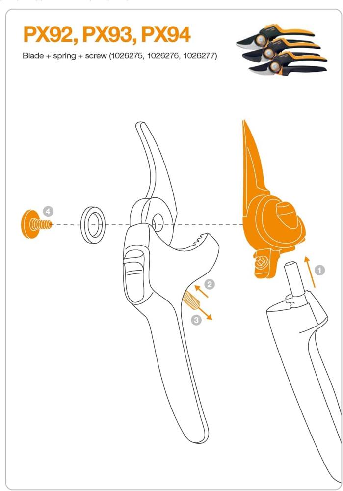 Lieferumfang: 1x Ersatzklinge, 1x Ersatzfeder, 1x Ersatzschraube, Für Fiskars PowerGear X Bypass Gartenschere PX92, Farbe: Orange/Schwarz, 1026275