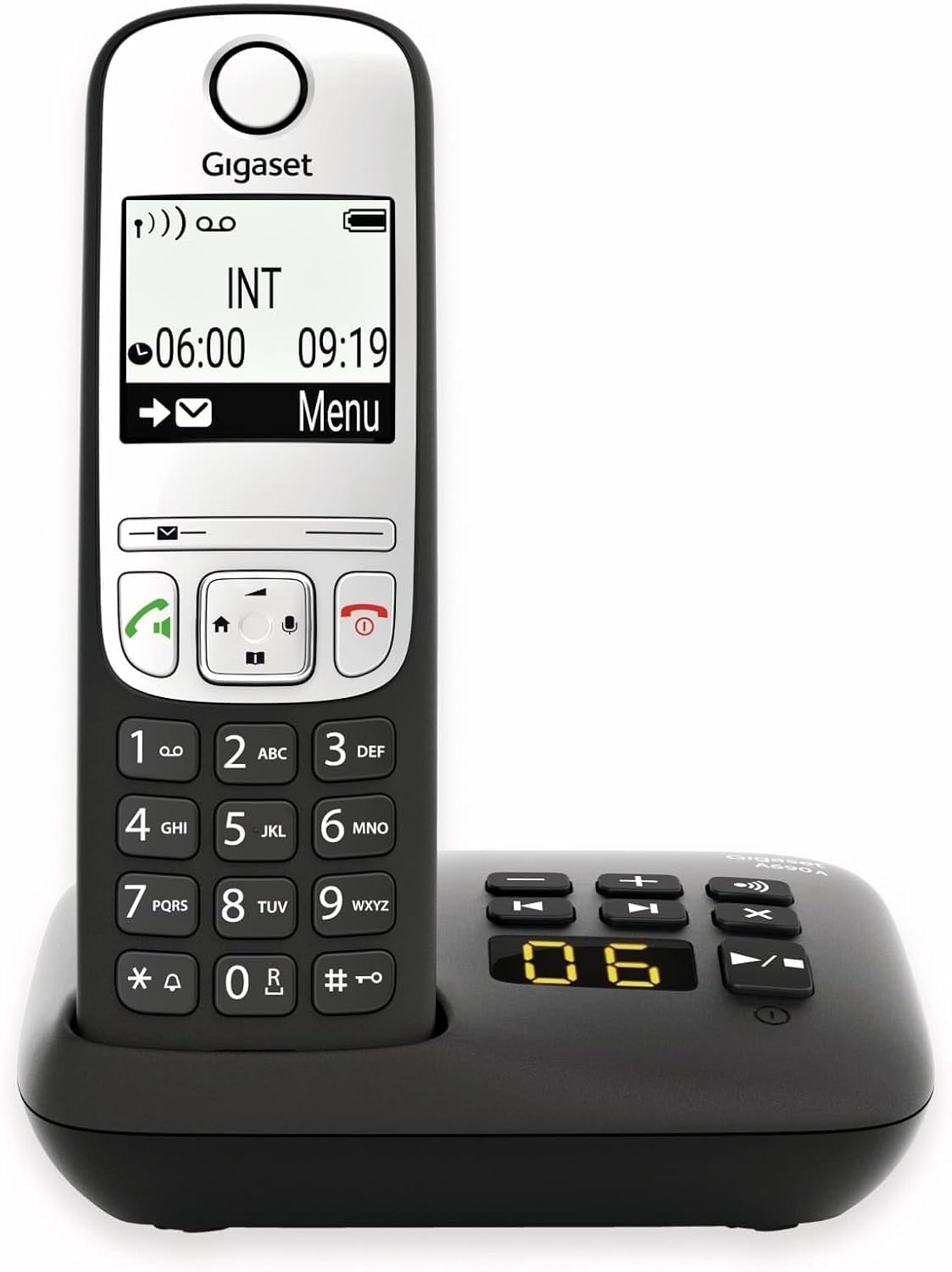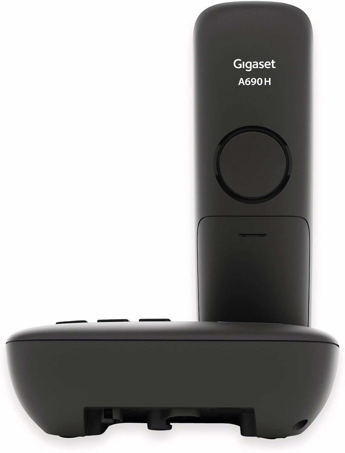 Gigaset A690A. Freisprechfunktion in bester Tonqualität. Beleuchtetes schwarz-weiß Display mit Anzeige von Datum, Zeit, Anrufanzeige für eingehende und verpasste Anrufe. Einfache Bedienung durch große, beleuchtete Tastatur. Telefonbuch für bis zu 100 Kontakte. 20 einstellbare Klingeltöne. Zusätzlich mit digitalem Anrufbeantworter mit bis zu 20 Minuten Aufnahmezeiten. Der ECO-DECT sorgt für geringen Stromverbrauch und für reduzierte Strahlung. Bis zu 14 Stunden Dauergespräch und 180 Stunden Standby. Reichweite im Freien bis zu 300 m. Maße: B13,7xH19,9xT13,3 cm