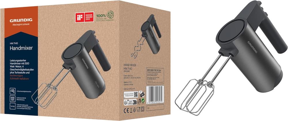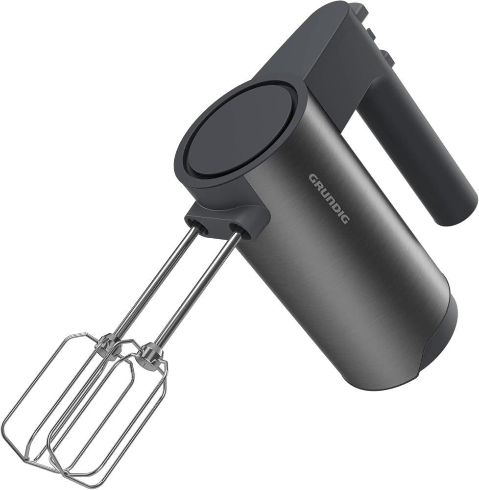 „Grundig” Handmixer. Leistungsstark und ergonomisch. 4 Geschwindigkeiten und Turbostufe für perfekte Ergebnisse in Sekundenschnelle. Soft Start: kein Spritzen. Hochwertige, spülmaschinengeeignete Edelstahl-Rührstäbe und Knethaken zum Mixen und Verarbeiten von Sahne, Saucen, Mayonnaise, Desserts sowie verschiedenster Arten von Teigen. 500 Watt. 3 Jahre Herstellergarantie