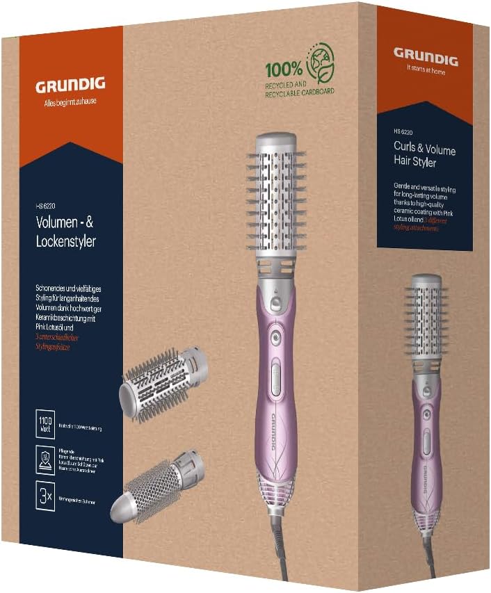 Grundig Volumen- & Lockenstyler HS 6220. 1100 Watt starker Lockenstyler für ein professionelles Stylingergebnis und langanhaltendes Volumen. 2 Temperatur- und Luftstromstufen zum Stylen und Trocknen. Mit feststellbarer Kühlstufe zur Fixierung der Frisur. Die hochwertige Keramikbeschichtung der Stylingaufsätze schützt strapaziertes Haar und garantiert eine gleichmäßige Wärmeverteilung für tollen Glanz. Mit 3 Aufsätzen in ø 25 mm (kleine Locken, Wellen), 40 mm (mittelgroße Locken) und