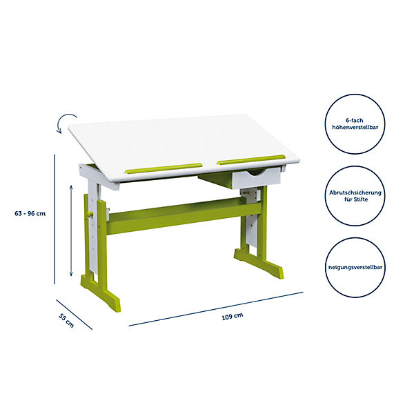 Viele Funktionen, wie z.B. die neigungsverstellbare Tischplatte, erleichtern das Arbeiten, Basteln oder Spielen. Das Schubfach ist in griffgünstiger Position montiert und bietet Stauraum für Hefte und Bücher.