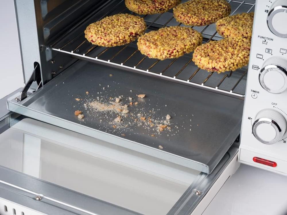 EINFACHE REINIGUNG – Durch das herausnehmbare Krümelblech und die glatte Innenfläche kann der Umluft-Ofen einfach gereinigt werden.