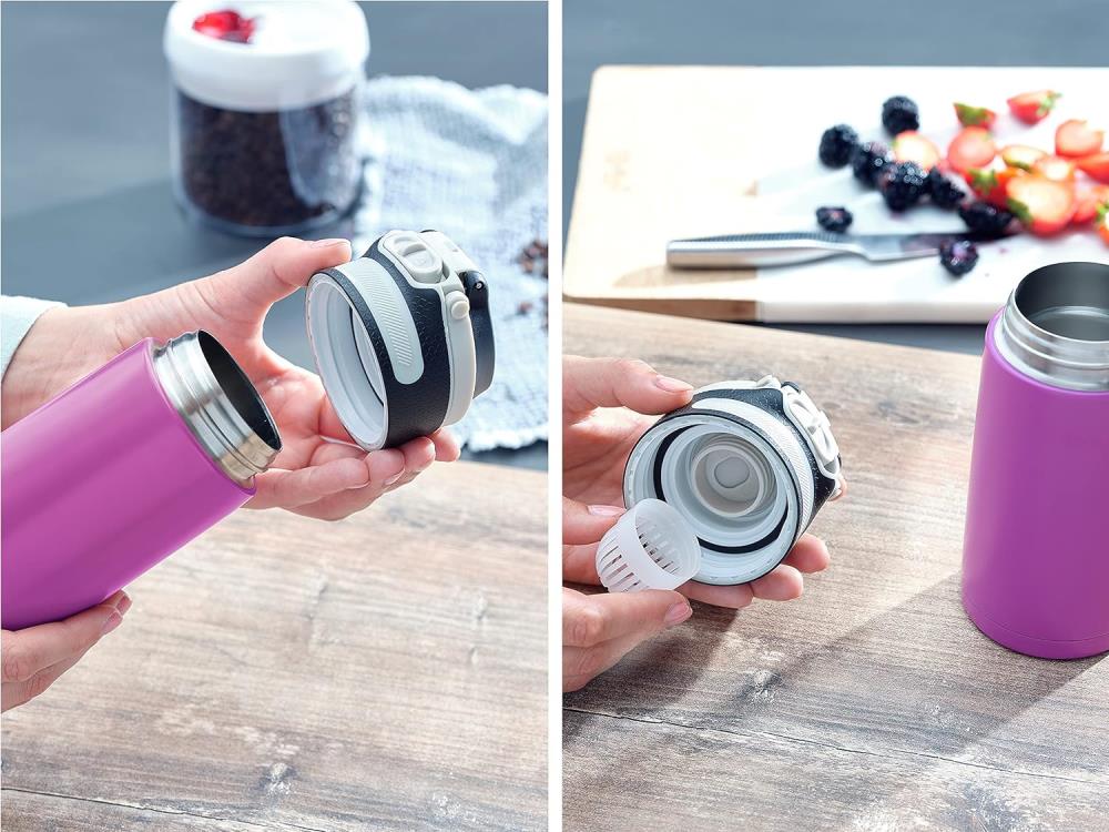 - Clever - der Isolierbecher verfügt über einen abschraubbaren Filter. So kann Wasser oder Limonade mit Obststücken oder Kräutern verfeinert werden. Der ausklappbare Griff ermöglicht komfortables Tragen