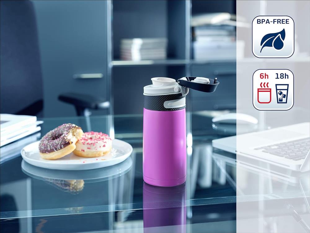 - Lieferumfang - Leifheit Thermobecher Flip 350ml, BPA frei, hält 6 Stunden heiß, ideal für den Getränkehalter im Auto geeignet, lila, Artikelnummer: 3246