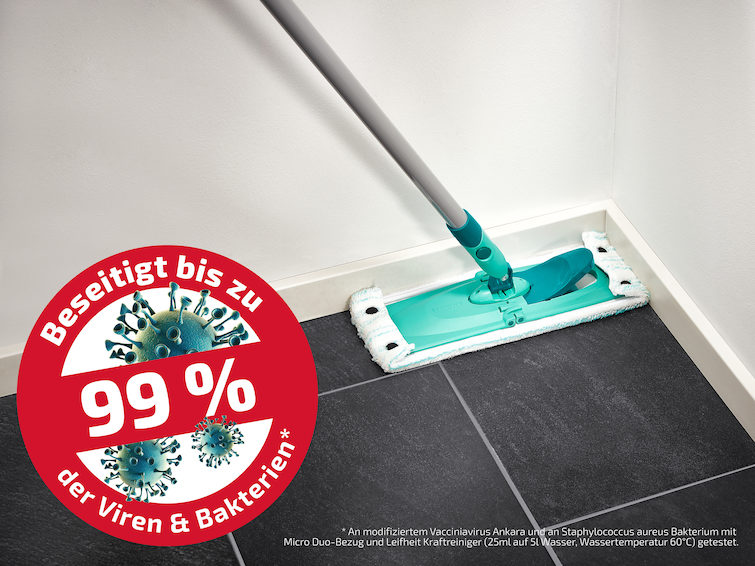 - Ecken und Fußleisten werden mit dem Rundum-Wischbezug in einem Schritt mitgereinigt