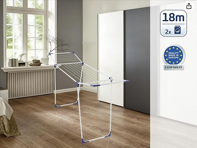 - Insgesamt 18 Meter Trockenlänge für bis zu 2 Waschmaschinenladungen Wäsche.