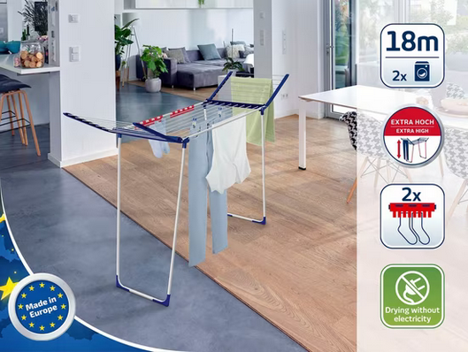 - 18 m Trockenlänge bieten Raum für bis zu zwei Waschmaschinenladungen.