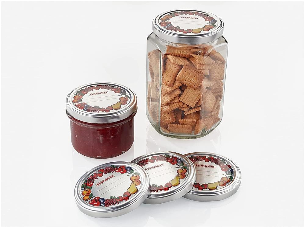 - Lieferumfang - Leifheit 10er Set Ersatzdeckel Glasmündung ø 82 mm, dekorativ verziert und zum Beschriften geeignet, Art. Nr. 3177