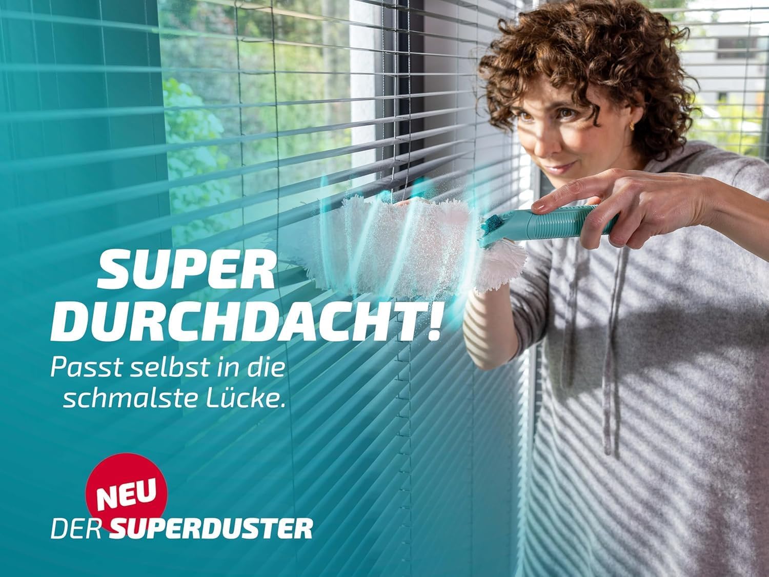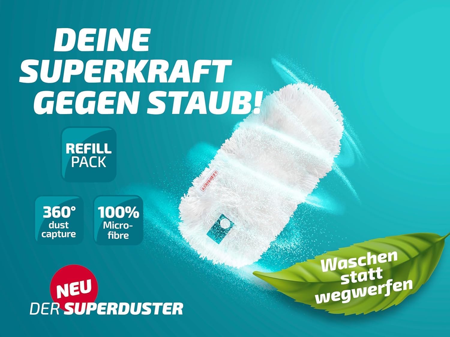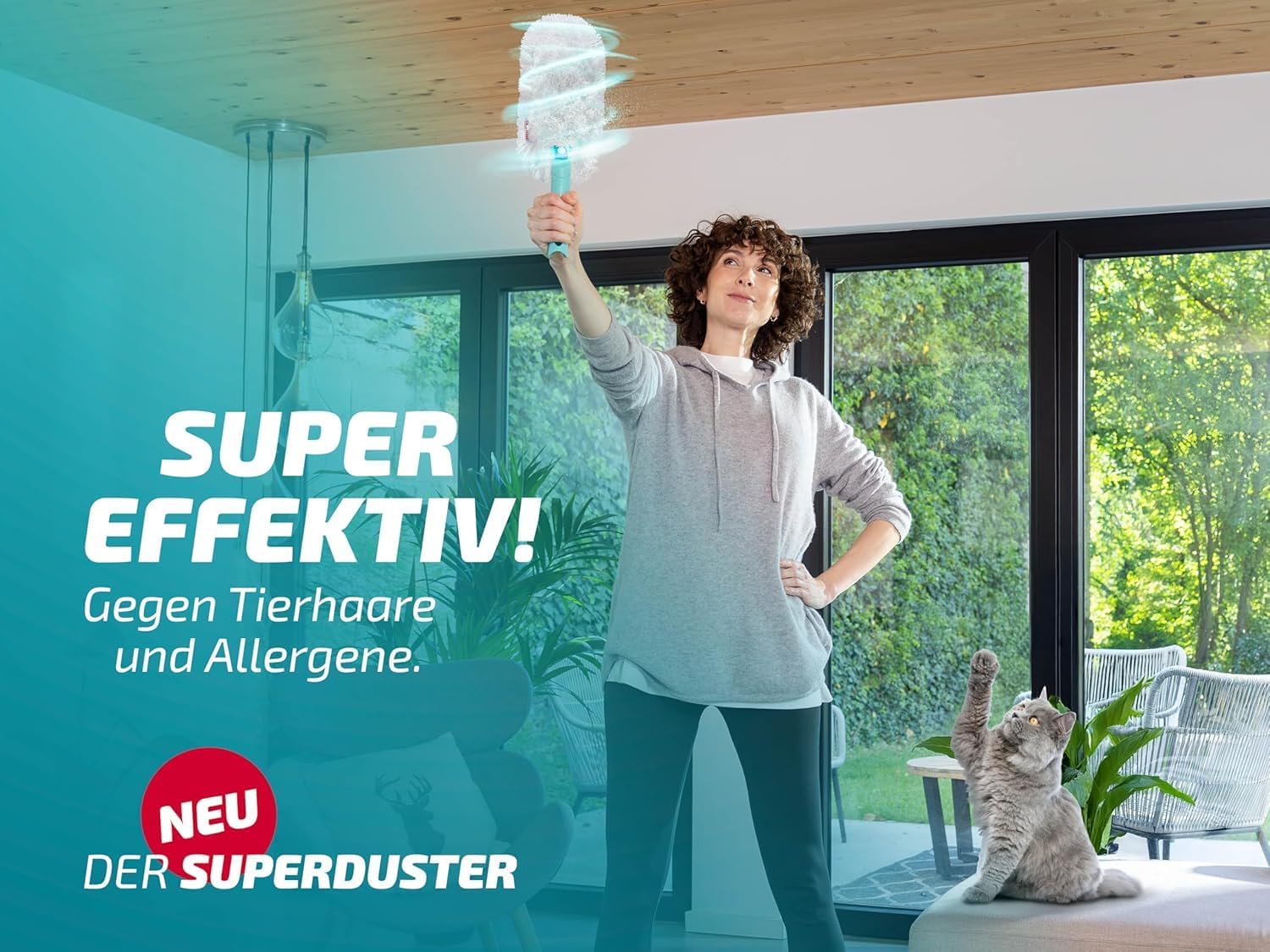 Die Superkraft gegen Staub – Der SUPERDUSTER Staubwedel mit 360 Grad-Mikrofaser hält was er verspricht: Staub, Haare und Allergene bleiben an ihm haften – dreifach super gegen Staub