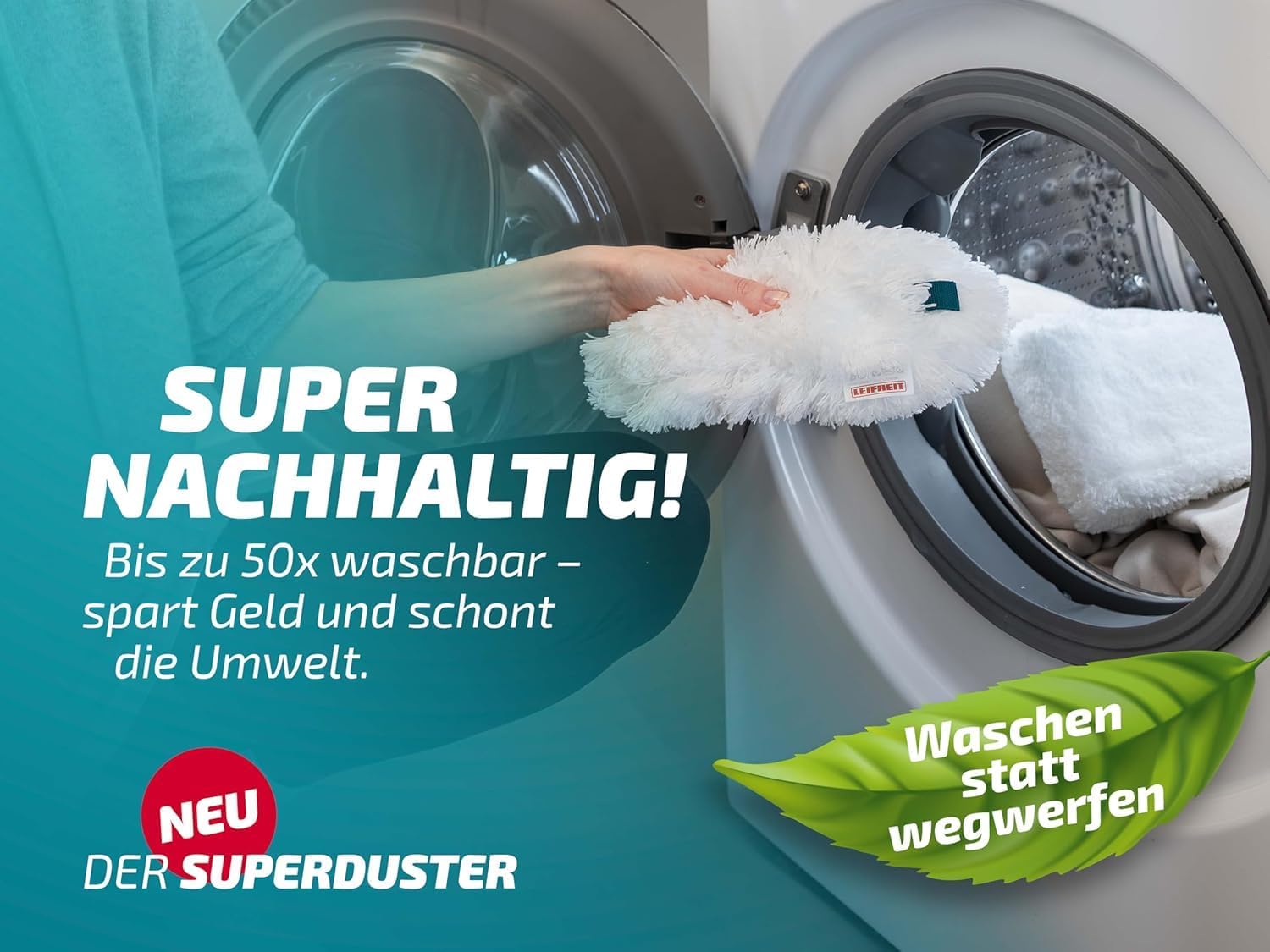 Waschen statt wegwerfen - Der SUPERDUSTER Staubwischer-Bezug hat sich gewaschen: Bis zu 50-mal bei 40 Grad Celsius waschbar und damit ein Helfer mit echter Superkraft gegen Staub