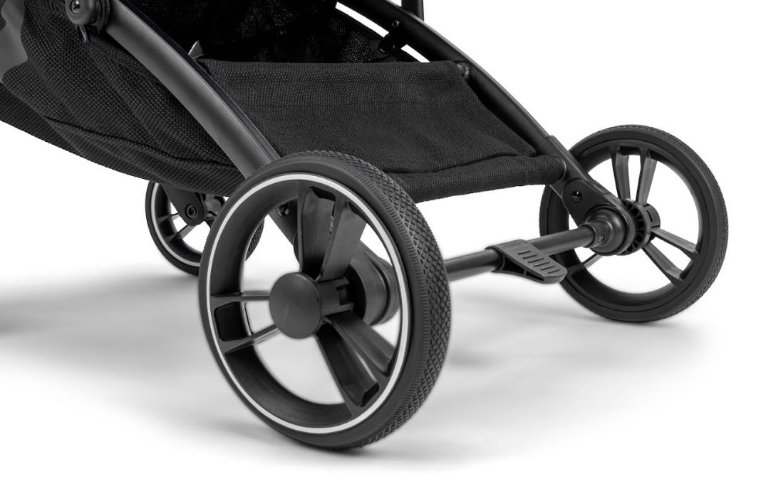 Ausstattung: Allradfederung, 360° schwenkbare, feststellbare & abnehmbare Vorderräder, abnehmbares und erweiterbares Verdeck mit UV-Faktor 50+, abnehmbarer und aufklappbarer Schutzbügel, einfacher Faltmechanismus mit Transportsicherung, stufenlos verstellbare Fußstütze, 5-Punkt-Gurt mit Polster, Feststellbremse, hohe Rückenlehne von 42 cm