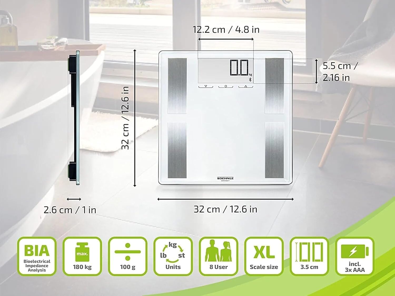 Die Körperanalysewaage Shape Sense Connect 100 mit Bluetooth® von Soehnle kann mehr, als nur das Gewicht anzuzeigen. Im Gegensatz zu einer normalen Personenwaage misst dieses Modell alle Körperwerte, die relevant sind für eine detaillierte Auswertung der eigenen Fitness: Körperfettanteil, Muskelmasse, Körpergewicht, Wasseranteil etc. Dies geschieht mittels BIA-Premiummessung. Die professionelle Körperanalysewaage liefert Messwerte wie im Fitnessstudio – dank der Bluetooth®-Funktion sogar bequem per App. Die Soehnle Connect-App ermöglicht einen unkomplizierten Überblick über die körperliche Entwicklung während des Trainings. Egal, ob Wunschgewicht, letzte Wiegung oder Abweichungen zum BMI – die Körperanalysewaage Shape Sense Connect 100 mit Bluetooth® von Soehnle gibt dank der Bio-Impedanz-Analyse fundierte Hinweise über die Fitness. Das große LCD-Display sorgt für bessere Lesbarkeit der Messwerte auch bei schlechten Lichtverhältnissen. Die Körperanalysewaage Shape Sense Connect 100 mit Bluetooth® von Soehnle ist jedoch nicht nur praktisch. Das edle und hochwertige Design, die große Trittfläche und das extrastarke Sicherheitsglas machen sie zu einem optischen Blickfang in jedem Badezimmer. Sie ist geeignet für ein Körpergewicht von bis zu 180 kg und zeigt die Werte in 100-g-Schritten präzise an.
