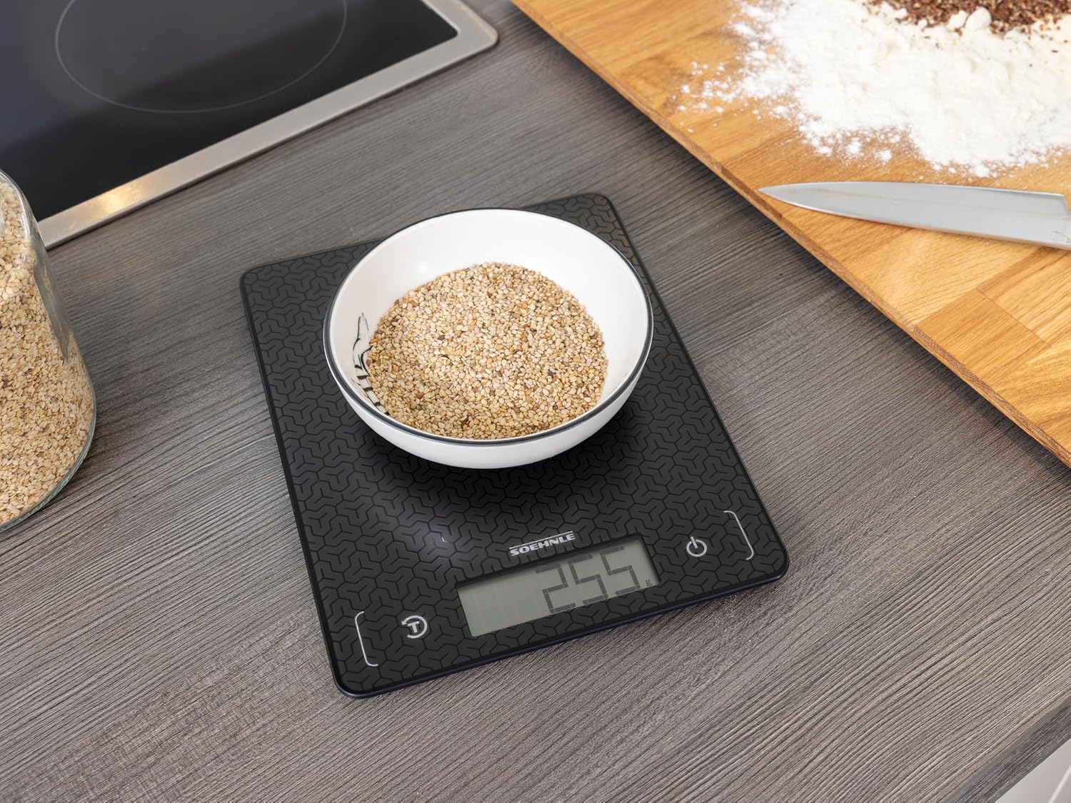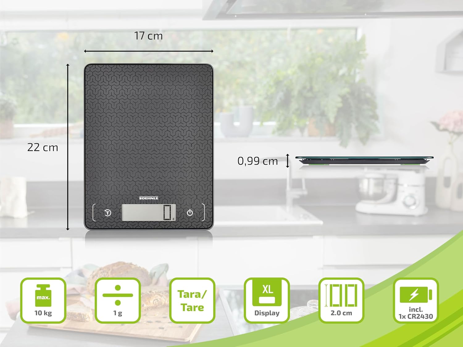 Praktischer Lieferumfang - Soehnle Küchenwaage Page Comfort Mosaic, für max. 10 kg mit 1g Teilung, LCD-Anzeige, Touch-Sensoren, Grammwaage mit Glasoberfläche, Farbe: schwarz, Artikelnummer: 61521