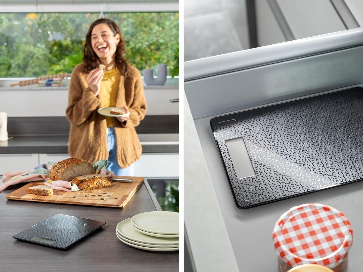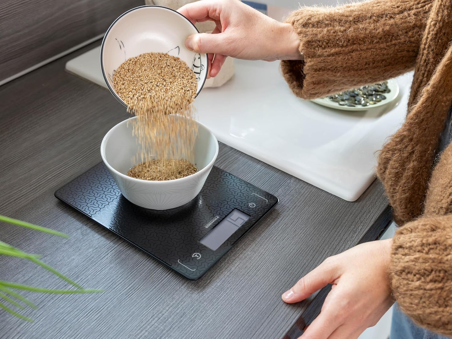 Komfortables Wiegen – Durch die praktische Zuwiegefunktion können in einer Schüssel mehrere Zutaten nacheinander abgewogen werden. Die Toch-Sensoren sowie die LCD-Anzeige vereinfachen die Bedienung