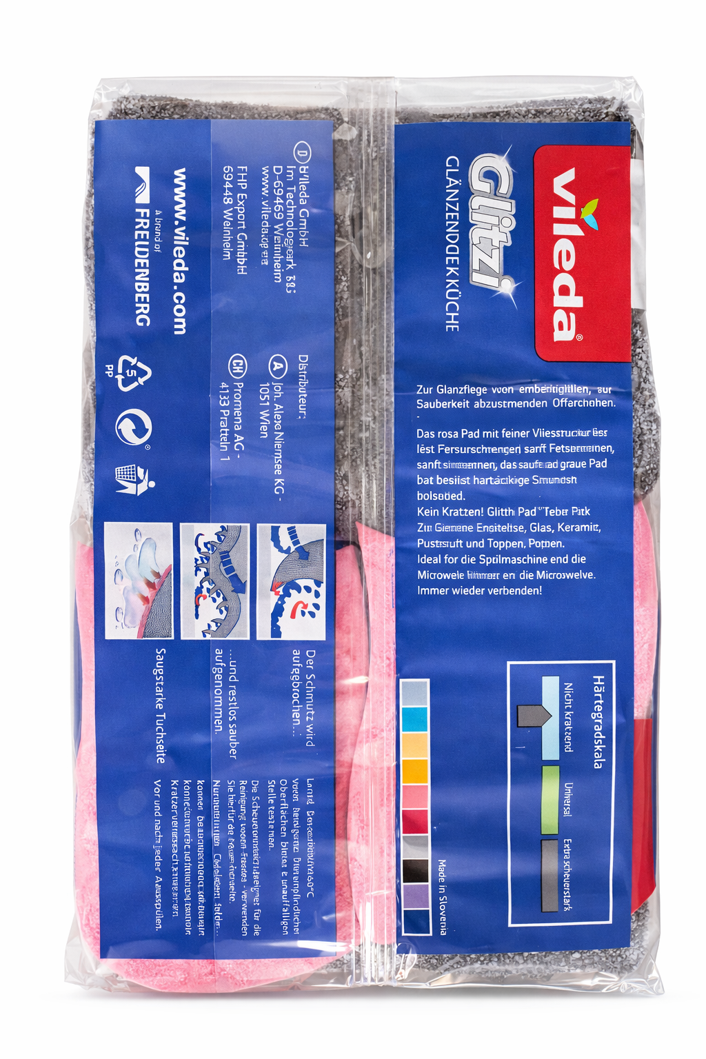 Seine 2in1-Funktion macht den Glitzi Glänzende Küche zu einem leistungsstarken Schwamm. Denn die patentiert Vileda-Scheuerfläche entfernt sanft selbst hartnäckigen Schmutz, ohne dabei empfindliche Oberflächen zu verkratzen. Anschließend nimmt die spezielle Tuchseite aus 100% Microfaser den gelösten Schmutz und auch Fett auf. Mit der saugstarken Seite gelingt selbst das streifenfreie Nachwischen. So entsteht strahlende Sauberkeit – und das vollkommen ohne chemische Reinigungsmittel.