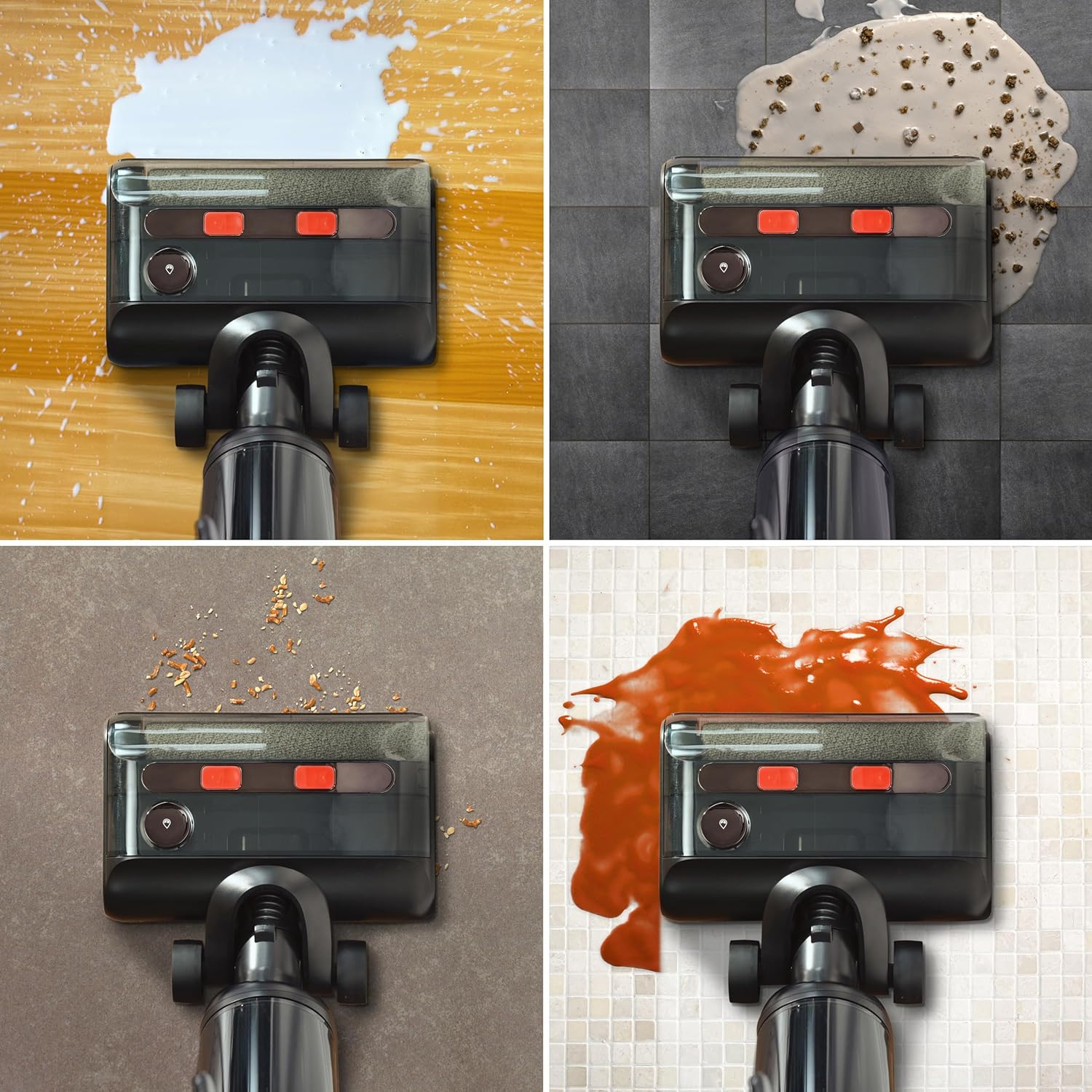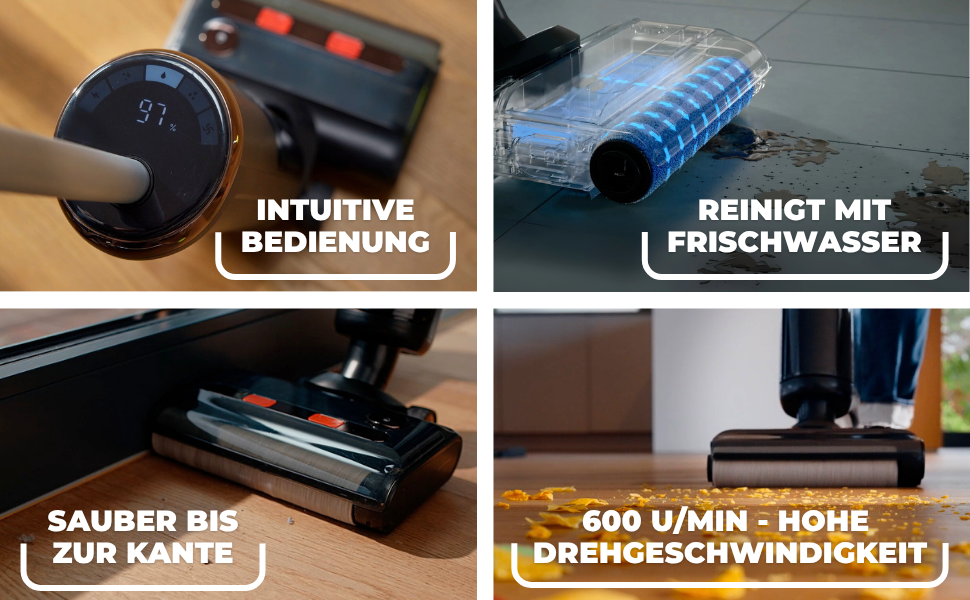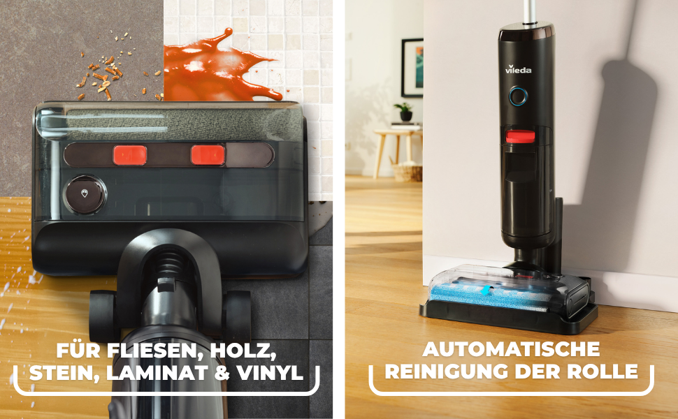 3-IN-1 REINIGUNG MIT WISCHSAUGER – Kehren, saugen & wischen in nur einem Durchgang – ideal für feuchte & trockene Verschmutzungen auf allen Hartböden.