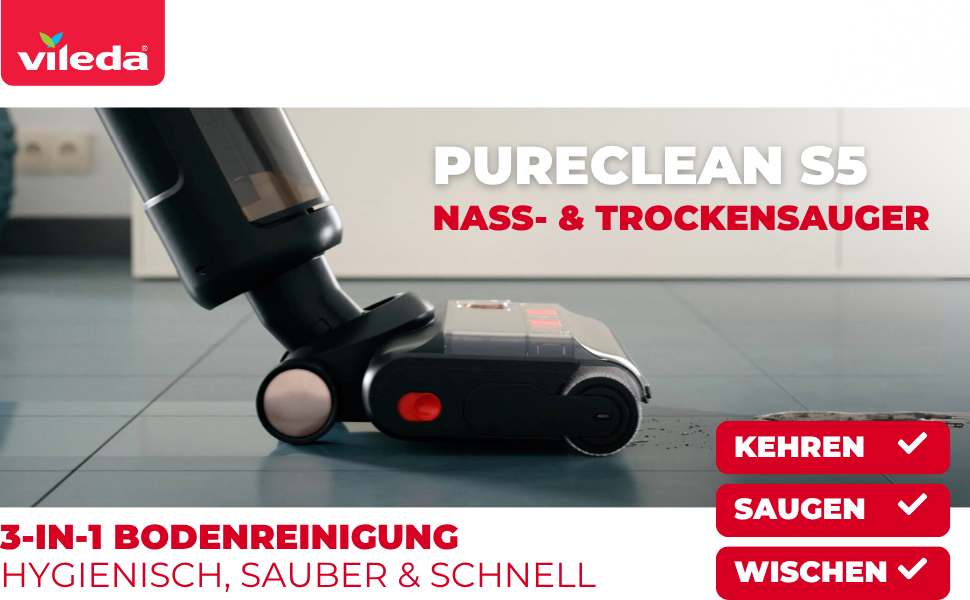 VILEDA PURECLEAN S5 PLUS NASS- TROCKENSAUGER KOMPLETT SET – Kabelloser Saugwischer, 2 Mikrofaserrollen, 2 Filter, Ladestation und Reinigungsbürste für hygienische Bodenpflege in einem Schritt.
