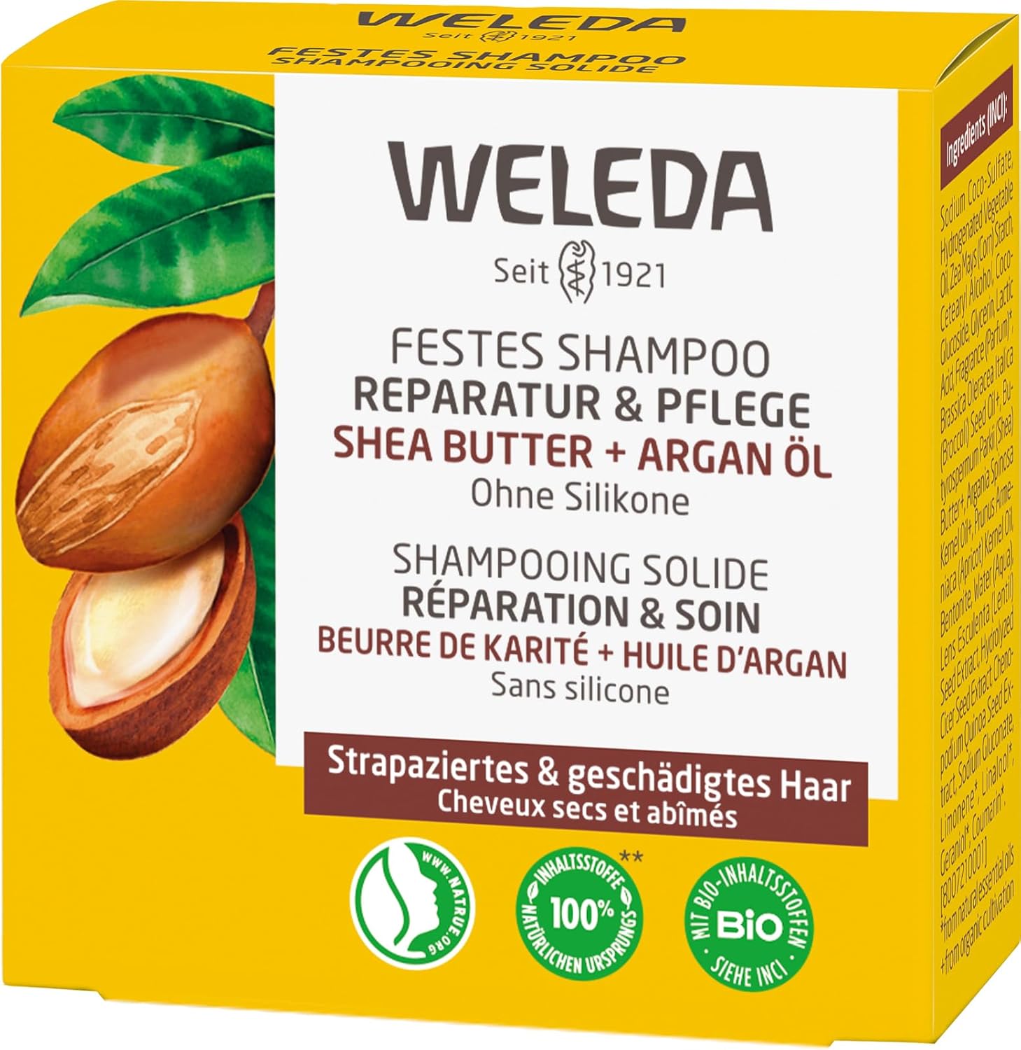 WELEDA Bio Festes Shampoo Reparatur & Pflege - Naturkosmetik Haarpflege Seife schützt vor Spliss & Haarbruch mit Bio Sheabutter, Arganöl & Keratin. Natürliches Haarshampoo ohne Silikone (vegan / 50g)