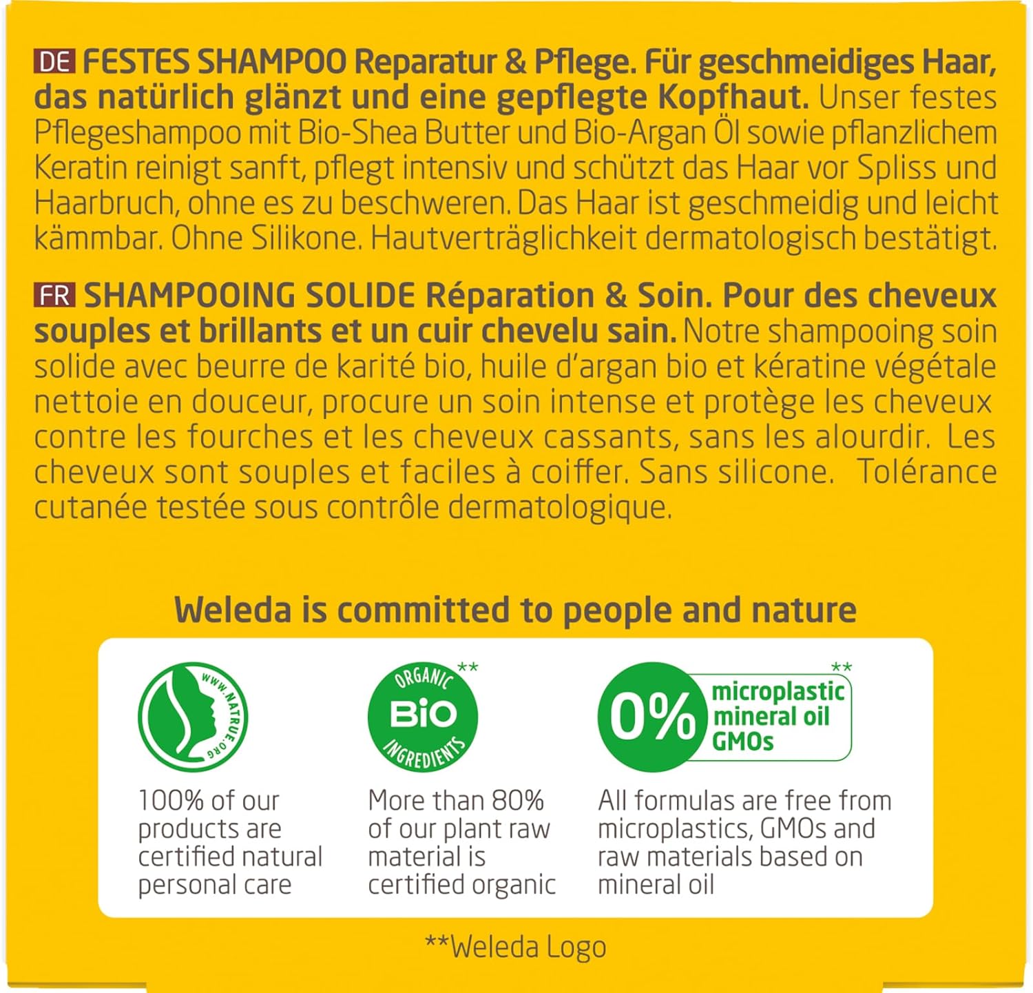 Produktinformationen "WELEDA Bio Festes Shampoo Reparatur & Pflege - Naturkosmetik Haarpflege Seife schützt vor Spliss & Haarbruch mit Bio Sheabutter, Arganöl & Keratin. Natürliches Haarshampoo ohne Silikone (vegan / 50g)"